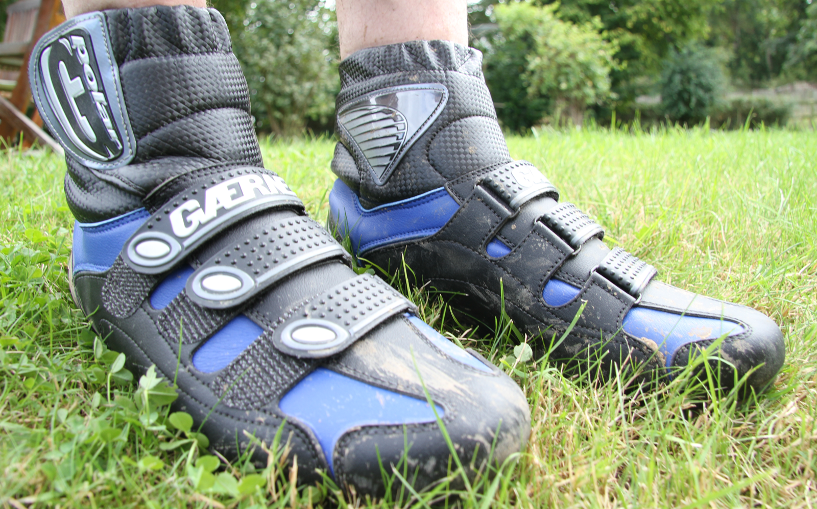 Gaerne Boots, is that pronounced Gay Ernie or Gear Knee? Who knows. Anyway, these are fully closed boots leather uppers with velcro fastners.